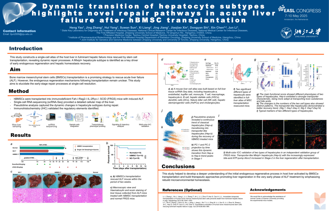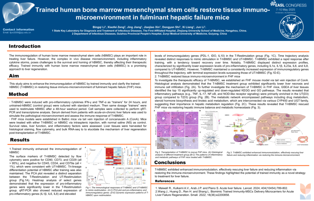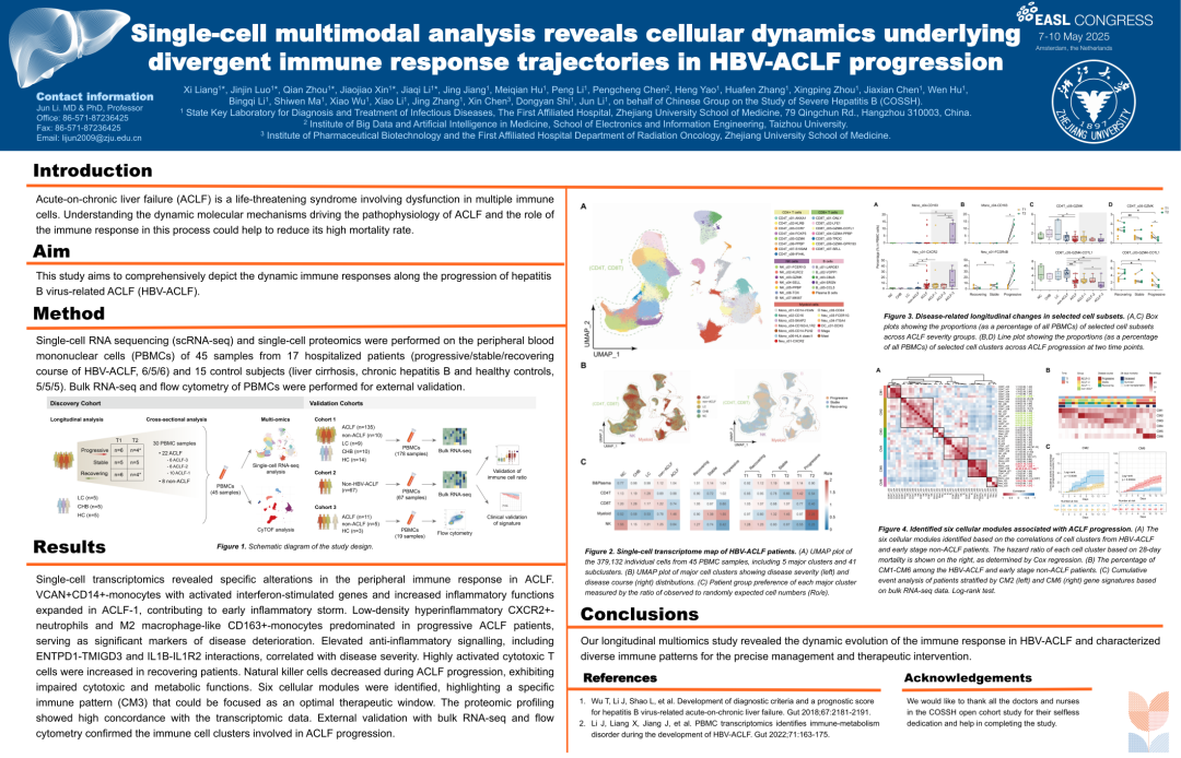 欧洲肝脏研究学会年会(EASL2025)暨国际肝脏会议(The International Liver Congress™ 2025,ILC 2025)于5月7~11日在荷兰·阿姆斯特丹,隆重举行。浙江大学医学院附属第一医院李君教授课题组涵盖乙肝肝衰竭(HBV-ACLF)发病机制、全病因诊断、免疫训练、胆管类器官等6项临床和基础研究成果亮相大会,现就相关研究内容进行报告。